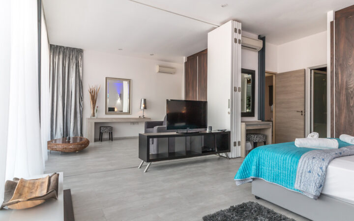 Andrijana Luxury Resort sits just moments from Nea Mesangala Beach, a long stretch of golden sand along the Olympus coastline. The beach is known for its calm, shallow waters — ideal for families with young children who want to wade and play safely at the water’s edge.